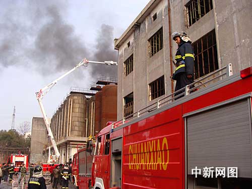 9日下午3时许记者在事发现场看到,6辆消防车停在火灾现场,消防官兵正在升起云梯架起高喷枪灭火,浓浓黑烟从车间三楼冒出,紧挨着该车间内的是数十个发酵罐。随后,记者上到车间二楼发现着火处为三楼的通风隔热层。由于该隔热层并没有通道进入,消防官兵只有在外围展开施救。