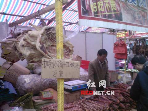 照片显示:一个简陋的肉类食品摊位,摊位前摆放着腊肠、熏腊肉等肉制品,一名中年男子摊主正和一名顾客进行买卖交易,摊位顶上挂着整头的干猪肉,四周是零乱地堆满了一些纸制品包装箱、红色塑料盆,摊位挂着“好吃不贵”条幅,最为显眼是支撑摊位的一根本柱上用一块硬纸板上用毛笔写着警示牌。