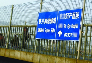 时先生所指的指路牌有四块。其中一块悬挂在新发地长途客运站门前的过街天桥南侧护栏上,正下方为进京方向辅路。这块蓝底白字的牌子上,并排印着京开高速辅路和某家妇产医院的字样,旁边还有相应的英文和箭头指明方向,并留有医院电话。