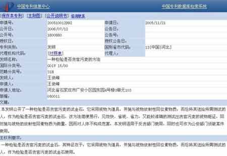 随后,信息时报记者登上了中国专利信息中心这个国家知识产权局直属单位的网站,根据网友“吕轻侯”提供的截图和信息,在中国专利信息中心的专利数据库检索系统仲搜到了这份申请(专利)号为200510012992.0的申请公开说明书。申请(专利权)人和发明人是一个家住河北省石家庄市,名叫王俊峰的人。提出申请的日期是2005年的11月21日,而该发明的全称为“一个检验是否贪官污吏的方法”。