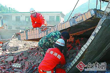 据介绍,当日12时12分,罗平消防大队接到县指挥中心指令称:阿鲁乡乐戈必小学的一所两层楼的危房倒塌,两名群众被埋,生死不明,情况十分紧急,请求救助。消防大队立即成立救援指挥部,下设侦查、警戒、保障、战斗等4个救援小组,迅速出动1车5名消防官兵火速赶赴事故现场。