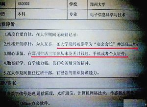 该网友在帖子中展示了她公司最近收到的一份求职简历的图片。图片显示,求职的是一名来自郑州大学的本科女生,专业是电子信息科学与技术。其中,最“雷人”的一部分在其自我评价一栏:“在大学期间被推举为“宿舍舍长”并连任三年;细心谨慎,在郑州生活三年多从来没丢过钱包、手机或者个人证件。”