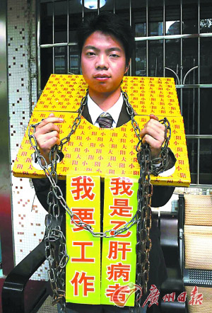 脖子上戴着一副自制“枷锁”,胸前挂着一块“我是乙肝病者,我要工作”的牌子——昨日上午,在广州恒福路及南方人才市场附近,一位“特殊”求职者的行为引起了人们的关注。