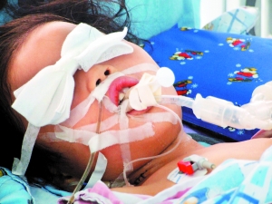 黄蓉今年6岁半,四川人。上了呼吸机的黄蓉被蒙着双眼,躺在病床上,虽然有心跳,但对外界的刺激毫无反应。主治医生说,其病情危重,“已接近脑死亡”。