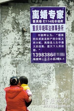 九龙坡区杨家坪一位法律工作者,在墙壁上挂出广告说:“离婚是人生中最大的涅槃,愿天下人再结婚”。此广告一石激起千层浪,引发众议。昨日,记者近距离接触了这位“离婚专家”。