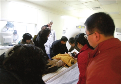 昨天下午5点,朝阳医院急诊大厅缝合室内,徐老师正在接受缝合手术。