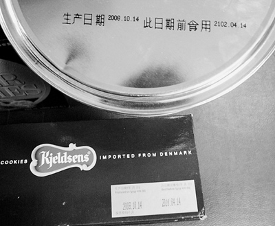 发帖人陈女士以直观的两张图片讲述了一桩雷人的事情。“丹麦蓝罐曲奇”铁盒底部,电脑喷码标示:生产日期2008年10月14日,2102年4月14日前食用。