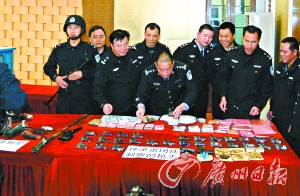 据了解,这个特大制枪贩枪案件是由一宗普通的涉枪和贩毒案中牵出的,从最初的破案到横跨粤、桂、贵三省区八县(市)区,将该团伙的40多名涉案人员抓捕归案,以及缴获已流出到市面的35支手枪和弹药,廉江专案组民警可谓历尽艰辛。