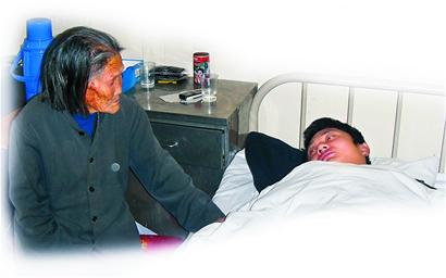 病床上躺着一个小伙子。他说,他叫郝长强,今年27岁,是老人的养子。