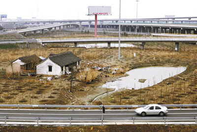 跨过一张已经被撕裂的铁丝网,快速奔过两条双向六车道的高速公路和往上海方向的匝道,那呼啸而过的车辆让我不寒而栗。强压住内心的恐惧,继续翻越往杭州方向的匝道,往前三百米,又穿越高架匝道,迈过杂草丛生、凹凸不平的地面,再往里前行二百米后,隐约看见一户被条条匝道环绕着的小屋。据村民介绍,这条“长征路”是唯一能到达王来英家的“通途”。