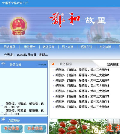 24日晚10时,记者在晋宁县政府门户网站()上看到,网站首页充斥着几十行“俯卧撑、打酱油、躲猫猫,武林三大绝学!”的字样,公示公告、政务信息、领导讲话、政务文件、政策法规、统计数据、招商引资、文化旅游等栏目原有的内容都被替换成“俯卧撑、打酱油、躲猫猫,武林三大绝学!”。除了一些图片无法删改外,所有的文章标题、图片的注释也都被改为以上字样。