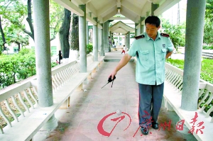 昨天中午,记者来到虎门执信公园找到该公园的保安队长刘建洪。据刘建洪介绍,事发当天晚上10时左右,正在执勤的保安朱泽兵,突然看见公园的楼亭上围有许多人。他立即跑前去,看见一名年轻女子满脸都是血,尤其是其左脸有一处很长很深的伤口。当时该女子满脸是血,正用手机给她的工友打电话:“快来救我,快来救我,我快死了……”说完话,那女子便晕倒了。朱泽兵当即用手机拨打110报警电话及120急救电话。他还叫来了多名在公园练习舞蹈的学生,一起抬起晕倒的女子跑向虎门医院。