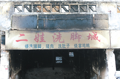 昨日,记者在九坑子农贸市场中找到了这家“最牛洗脚城”,由于该地段即将拆迁,该店铺内早已空无一人,但“二娃洗脚城”的招牌依然高挂在这家仅10平米大小的店门前,在这片凌乱的地方,显得十分醒目。