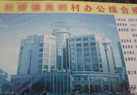 近日,一组在网络上号称“史上最牛的村办公楼”图片在网上热传,一张图片展示了一幢主体框架已经建好的雄伟大楼,另一张图片是该大楼建设的效果图,效果图中的大楼相当豪华,高达9层。令网友诧异的是该幢大楼竟然是一村办公大楼,难怪发帖者称该楼为史上最牛的。