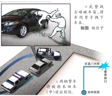 知情人透露,那辆本田车被抢后,该车司机立即拨打110报警,北京警方随即向附近所有执勤的民警、武警、警车发出围堵命令,在全城范围内堵截这辆黑色本田车。上午10点,一辆武警巡逻车和一辆110巡逻车按布控指令行驶到东直门内大街时,发现了正在疯狂逃窜的本田车,两辆巡逻车立即鸣响警笛一路追去,并最终将本田车别住,抓获犯罪嫌疑人。