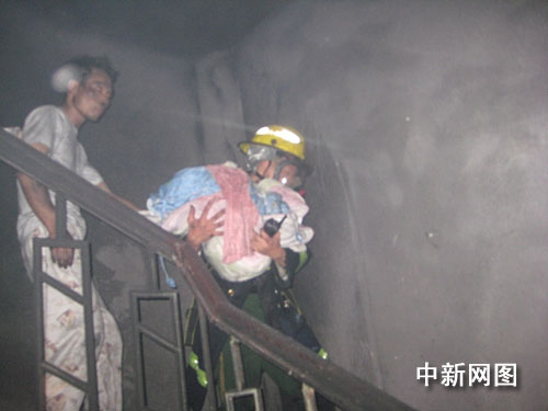 了解情况后,指挥员立即命令官兵迅速展开灭火营救行动,铺设两支水枪进行灭火,及时消灭楼梯口的火势和浓烟,两名官兵佩戴空气呼吸器顺着楼梯间深入楼内救人,将13名被困人员分批救出,其中有一个2个月的婴儿。经过1个多小时的奋勇战斗,大火被扑灭,被困的居民也全部被救出。