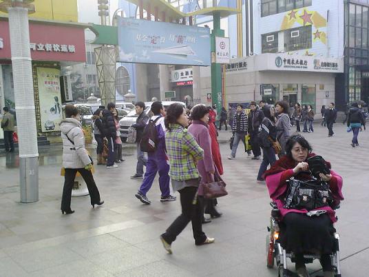 “救救这个22岁的新娘子吧,谢谢你的爱心。”残疾人刘冰心坐着电动轮椅在青岛市区为白血病新娘高俊峰奔走呼告,筹集“善款”。