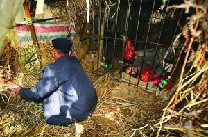 3月15日下午3时许,广西脑科医院的专家与三江侗族自治县林溪乡美俗村美俗屯的村民,来到距该村七八百米远的一座小山上,他们撩开一座低矮小窝棚上的稻草时,一名蓬头垢面的青年男子赫然躺在一个狭窄的铁笼里!站在旁边的该村村民杨付于夫妇,此时早已老泪纵横——铁笼里正是他们一直引以为荣的惟一34岁儿子杨盛敏。