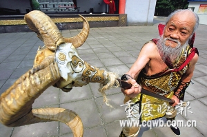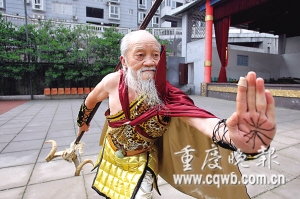 昨日上午,渝北两路巴渝民俗文化村气温12℃。89岁的刘子均光着膀子、身披紫色披风、手持羊角骶兵器,迎风摆开阵势,开始了一场古代巴人求生存狩猎的武术表演……