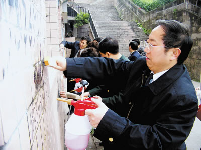 手拿刷子、喷水枪和抹布,公务缠身的书记、县长亲自动手清除城市“牛皮癣”。3月13日,一网友在大渝网三峡吧发出的帖子《云阳书记县长走上街头清除“牛皮癣”何需亲历亲为?》,引发网友热议。有网友不解,书记和县长何必在百忙之中对此“小事”亲历亲为。从山东到云阳交流任职的云阳县委书记李洪义昨日介绍说,云阳县正在创建国家卫生县城,他希望通过自己的行为,号召大家一起关心城市环境。