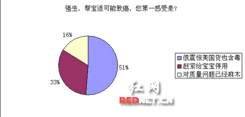 近日红网一项得到近5000张投票的专题调查显示,近51%的网友听闻此事后感觉震惊,近97%的父母表示近期或今后将不再使用强生、帮宝适等美国品牌婴儿卫浴产品。如果含毒事件为真,64%左右的使用者会对这些产品提出控诉。