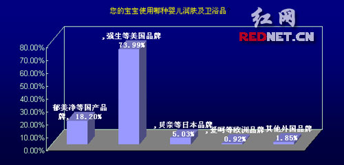 另外,调查显示近74%的父母为宝宝使用强生、帮宝适等美国品牌卫浴产品,其次有18%使用郁美净等国产品牌,其他外国品牌的使用率不足8%。