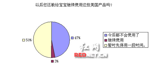 对于今后是否还会使用强生、帮宝适等产品,近47%的网友表示“以后都不会使用了,宝宝的生命要紧”,近50%的网友表示“持观望态度,暂时停用一段时间”,两者总和高达97%。仅剩下3%的网友明确表示,将继续使用这些品牌的产品。(董雷)