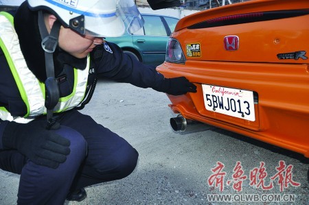 17日下午,烟台市交警一大队交警在南大街路段巡查时,查住一辆雷人的老款本田轿跑车,该车车牌写的全是外文。据驾驶员本人讲,这副车牌是美国加利福尼亚州的车牌,他觉得洋车牌新鲜、气派,便找别人弄到一副作废的挂上了。交警表示,这种做法显然是违法的,车主将面临处罚。(记者 张琪 通讯员 赵亚林 温全福 摄)
