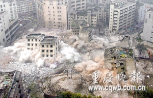 “5、4、3、2、1,爆破!”8点整,在总指挥的命令下,只听见一声巨响,6栋楼同时轰然倒下,眨眼工夫就淹没在浓烟中,仅用时1.5秒。随即,消防车开始喷水控制扬尘。