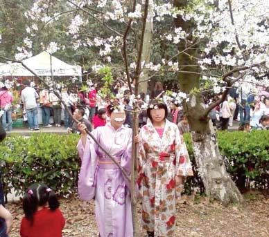 下午3时左右,两个穿日本和服的女子出现在樱花大道上,年纪较长的穿了件淡紫色和服,另一年轻女孩穿一件彩色和服,两人站在樱花树下合影留念。给她们拍照的是一位中年男子,随行的还有一位年轻女子。4人都操武汉口音,在樱园逗留了近10分钟,引来很多赏花市民的目光。