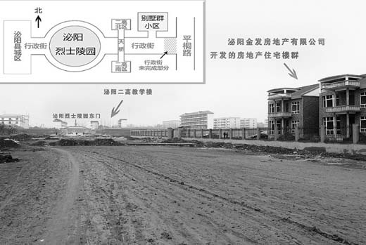 从空间位置上看,由金发房地产开发公司所建的住宅楼在烈士陵园东侧约1公里的地方,中间间隔了泌阳县第二高中校园。住宅楼及别墅区并没有侵占烈士陵园土地。