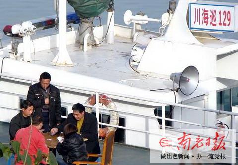 3月25日,记者在四川新闻网麻辣社区里看到,有关南充市地方海事局工作人员上班时间在海事船上打牌的图片格外引人注目。网友称其为“嘉陵江上最‘牛’游船”。记者在网上看到,一艘标有“中国海事”字样的船,停泊嘉陵江三桥附近,紧挨此船停泊的是一艘“川海巡129”执法船。