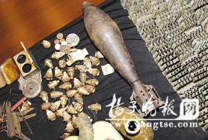 为什么如此热衷于征集侵华日军遗物?听了张广胜的自述,记者才知道原来他的外公就是在抗日战争中被日军将双眼弄瞎的。“小的时候我常听身边的老人们讲故事,讲到日本侵略者的暴行,在我心里留下了深深的烙印。后来工作了,有一次下乡,我还记得那是1998年,偶然在一个山村里见到一个放羊人,他将头羊拴在地上吃草,而我惊讶地发现,他用来拴头羊的那根铁杆竟然是日本二战时最常用的三棱式刺刀。这使我一下子想起许多童年听到的故事,我觉得有必要把这个刺刀带回去给大家看看,从这开始我经常利用业余时间上山下乡,去寻找当年日军在东三省留下的遗物。”