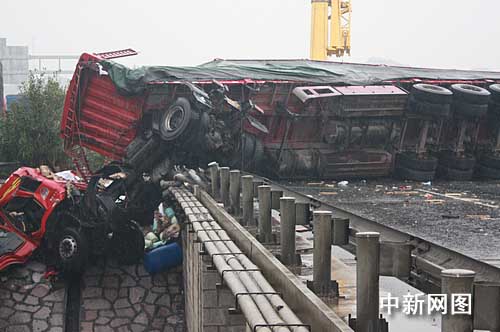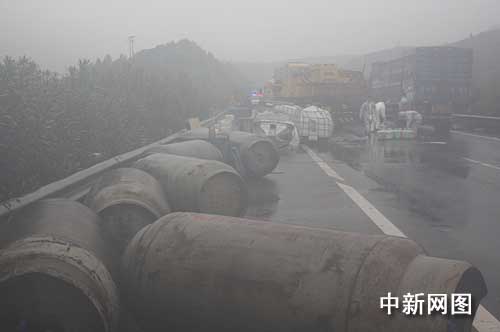 事故的影响,当天上午9点多,高速公路上被堵车辆绵延数公里。大挂车虽已被吊离,但现场地面上仍冒着白烟,附近散落着许多木箱、玻璃碎片和一些装有危险品的大桶。安监、环保等部门做了现场勘查,工作人员用石灰中和等多种措施来减少酸性物质对周边土壤的腐蚀。