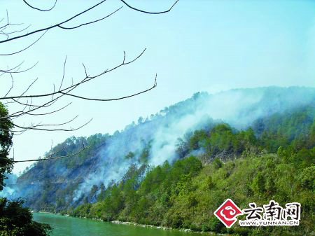 记者看到,江对面的两面山崖,一面山崖的植被已经彻底烧毁,一片焦黑,仅有余烟;另一面山崖浓烟正起,不时可见明火。村民说,这些天天气干燥,再不扑救,就怕难控制了。村民告诉记者,前面不远就是林区派出所。