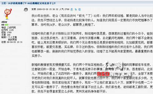 “现在婚姻都得先考虑对方有没有房和车”,近日,网友“aijiay”在红网论坛贴出一篇题为《26岁的我离婚了!80后婚姻注定死在房子上》的帖,帖中称83年出生的她两年前与82年出生的老公在北京租房完婚,后因“身边的同事有车有房”而萌生买房念头,最后却因手头拮据多次发生争吵后离婚。此帖短短几日引来网友阵阵热议,支持有赞赏同在,也有人无奈感叹。