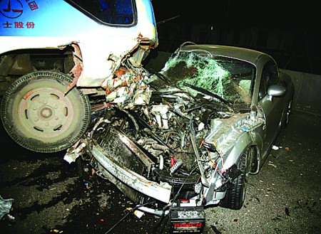 7日零时10分许,一车牌为鲁BME5XX的奥迪TT跑车,在沿东西快速路由东向西方向行驶至三百惠附近时,因超车与前方一辆同向行驶的中巴车相撞,由于冲击力巨大,两车腾空而起飞出数米远后坠地,落在一辆原本与中巴车并列行驶的出租车前。“我还没反应过来,就听到‘砰’一声,两辆车从天而降,落在我的车前方不远处,我赶紧刹车。”事后接受交警调查的目击者、一名出租车司机回忆道。据另一位目击者王先生称,当时他驾车以每小时90公里的速度行驶,只见一个银灰色的影子从自己车后窜到前面,估计车速在每小时140公里以上,该车与前面的中巴相撞时,没有采取任何减速措施,基本是踩着油门撞上的,随后就见到一白色的影子被甩出奥迪车,摔在路上。