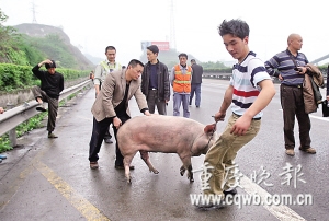 2008年2月26日,渝黔高速路金竹岗隧道,5肥猪“跳车”拦路,一辆奥迪将2头猪撞死,隧道交通中断1小时。