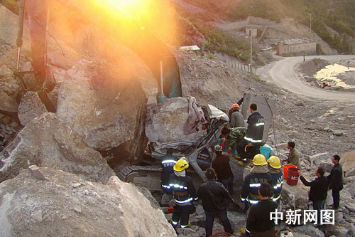 发生滑坡事故地点位于上屋采石场的半山腰,消防队员携带破拆工具徒步上山。在现场,挖掘机被两块巨大的石头压得面目全非,驾驶室已被压得完全变形。一名40多岁的司机被牢牢压在驾驶室内,为防止再次滑落,几名工人用钢钎将巨石牢牢顶住。
