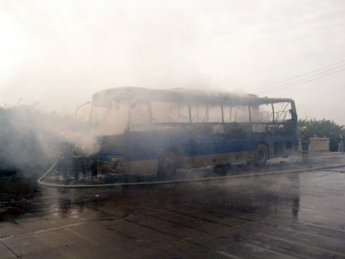 中新网宁波4月12日电(见习记者 何蒋勇 通讯员 郭正强 )今天上午,一辆满载公司员工上班的 “浙B22199”大巴车,从浙江省宁波市区开往北仑小港的途中,发动机部位突然起火,所幸车上员工及时逃出,未造成人员伤亡。 据了解,上午7时50分,宁波高新区消防大队接到报警后,立即出动三辆消防车赶赴现场。7时56分,消防官兵到场时,发现熊熊的火势正笼罩着大巴车,起火部位在车体的前部,火苗正在向车尾蔓延,燃烧产生的大量浓烟弥漫半空。此时,空气中混合着强烈的汽油味,大巴上的油箱由于长时间烘烤,随时都有可能发生爆炸,而在西北方200米处正好有一个加油站。如果油箱发生爆炸,后果将不堪设想。 通过询问报警人和火情侦察,消防官兵了解到车内并无人员被困,现场指挥员当即命令出两支水枪,一支从车头对着火势最猛烈的部位进行灭火,另一支从车尾进攻,阻止火势蔓延。在水枪的掩护下,司机指引消防官兵很快找到了油箱的位置,经过10多分钟的冷却,油箱得到了保护。8时30分,大巴火灾被彻底消灭。堵塞的交通要道又恢复了畅通。 “当时交通比较拥堵,在送员工上班途中,突然看到车头在冒烟。我赶紧停车,一边让员工紧急疏散,一边赶紧拨打了119。我试图用毯子盖住火苗,还拿了一个车载灭火器灭火,可根本起不了作用,火越烧越大。”事后,大巴司机林师傅说。 目前,起火原因正在进一步调查之中。