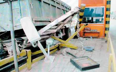 昨天上午,一辆拉沙石的大型拖拉机突然失控,直接撞向108国道黑河大桥收费亭,致使正在亭里值班的两名收费员受伤。
