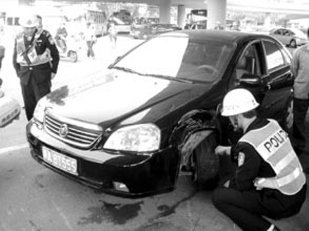 昨日16时许,记者在现场看到,一辆牌号为赣A8T555的黑色小车停在桥下转盘处,车头左侧凹陷严重,左车轮也瘪了气。