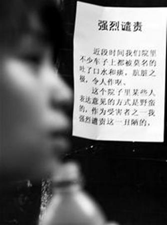 1年多来,家住忠烈祠西街80号的一些车主遭遇了一件怪事:他们停放在小区的爱车,不时会发现被人吐上了口痰。为此,住户杜先生在小区门口贴了一份《强烈谴责》,不料“神秘人士”竟然将口痰包在纸中,放在他的车上……昨(21)日,杜先生无奈地表示,希望对方能停止这样的行为,有意见面对面协商解决。