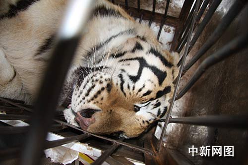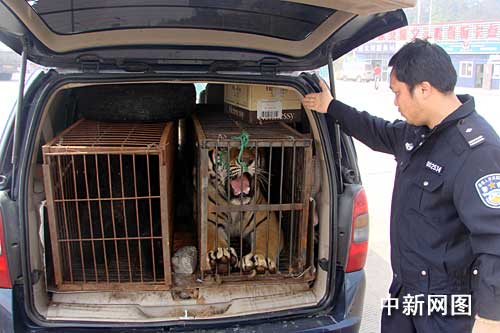 此时,一阵阵沉重的低吼声不时从车内传出,似乎车内“乘客”早已焦躁不安。待民警打开商务车的后备箱时,在场的人都被眼前的场面吓了一跳。狭小的后备箱里安装了两个十分简陋的大铁笼,笼子里赫然是一只花斑猛虎和一只大黑熊。由于车厢内十分燥热,两只庞大的猛兽被困在这样狭小的空间之内,显得异常暴躁,见有人打开车门,花斑虎更是猛张血盆大口,发出沉重的低吼,不断用爪子撞击笼门。整台车在老虎的巨力敲打之下摇摇晃晃,而笼门上几根用来束口的细钢筋,感觉随时可能被巨力挣脱。