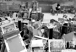 昨天上午,黄龙体育中心的西门口,3000多台赌博游戏机堆积在此,很快,这些赌博机被铲车砸得支离破碎,送上了垃圾车。