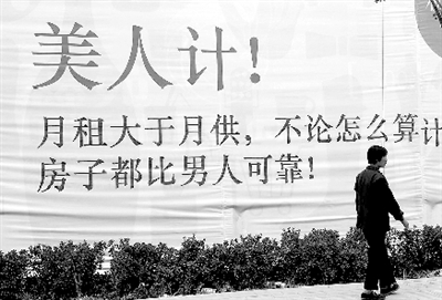 “宁可相信世上有鬼,也不能相信男人那张嘴。”这句众女传阅调侃男性的话语,近日却被变相地搬上台面,成为商家夺人眼球的广告语。“月租大于月供,不论怎么算计,房子都比男人可靠!”近日,棉纺东路某房产商的一条广告引发了一场关于广告与男性尊严的争论。