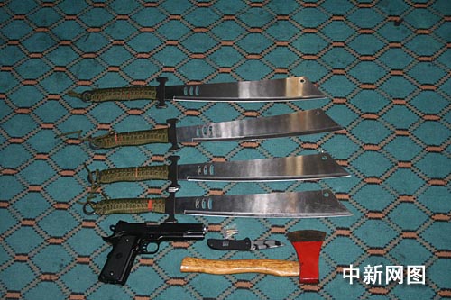 一切部署完毕后,4时40分,武装民警分别破门而入,其中一间房内,8男1女聚集在一起正在赌赙和吸毒,另一间房内1名嫌疑人还在呼呼大睡。这伙人还没来得及反抗,全部束手就擒。警方在两间房内搜出一把仿“五四”式手枪及子弹两发,另有6把砍刀和1把匕首。