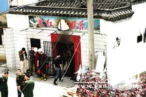“爱红棋牌室”西侧紧挨古运河,在一条名为“缺口河东小街”的巷子的最里面。记者在现场看到,“爱红棋牌室”东、南、北3面道路周围都被警方用2至3道警戒线封锁,大量警力在现场维持秩序。由于围观群众太多,跃进桥上的警戒线出现了多次被人潮挤断的情况,民警及时进行修复和更换。