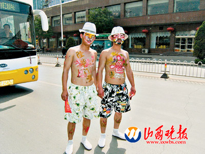 4月28日中午,两名年轻男子赤裸上身,前胸后背画有彩色图案,在(山西)忻府区的繁华街市中游走。