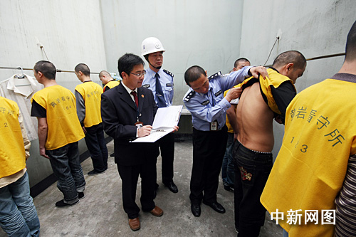 中新网台州4月30日电(记者袁爽 通讯员喻跃翔 陈静)浙江省台州市黄岩区看守所严格监所管理制度,严防出现“牢头狱霸”现象,近日,该所民警会同驻所检察官、分局警务督察民警一起对在押人员身体状况进行检查,严防“躲猫猫”事件发生。(完)